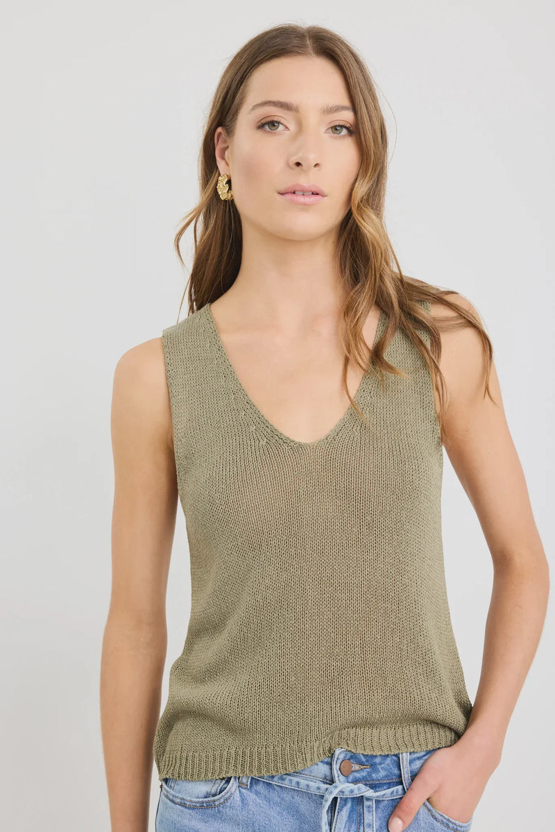 Stories Be Told Settler Khaki V Neck Sleeveless Knit Top